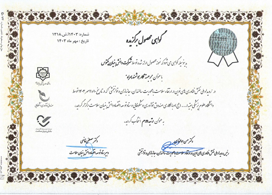 10 مهر ماه 1403 اولین رویداد ملی نقش فناوری های نوین در ارتقاء سلامت با محوریت، سالمندان ، جانبازان و توانبخشی توسط دانشگاه علوم پزشکی بقیه الله و با همکاری صندوق نوآوری و شکوفایی و ستاد توسعه اقتصاد دانش بنیان سلامت برگزار گردید که شرکت دانش بنیان پکتوس با ارائه برجسته نگار هوشمند همراه توانست رتبه دوم محصول برگزیده را از آن خود کند. متن نامه به شرح زیر است: