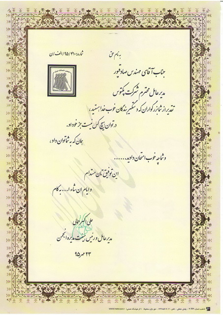 علی اکبر جمالی، مدیر عامل و رئیس هیئت مدیره انجمن نابینایان ایران در مراسم بزرگداشت روز جهانی ایمنی عصای سفید که در مجتمع پردیس قلهک تهران برگزار شد، به پاس طراحی، نصب و راه اندازی سامانه خدمات بانکی ویژه نابینایان در برخی از شعب بانکهای شهر، آینده، پست بانک ایران، صادرات، سپه، تجارت، کشاورزی و رفاه کارگران، به شرکت دانش بنیان پکتوس اعطاء کرد.